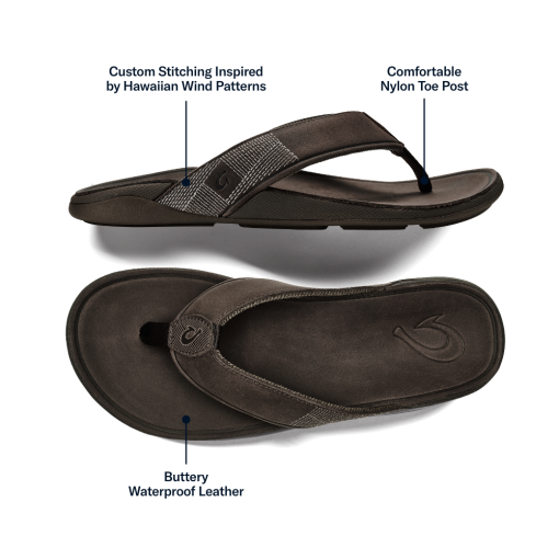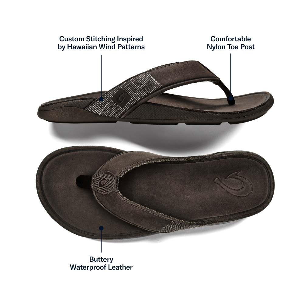 The Tuahine elevates your everyday sandal experience. Designed for all-day wear, it offers all-day comfort and features waterproof leather, making it a versatile choice for any day's activities. Tuahine is perfect for strolling through town to relaxing by the beach. Distinctive details, such as custom upper stitching inspired by the cool Hawaiian winds, add a distinct touch of OluKai craftsmanship. Key Features:Waterproof Leather: Made with waterproof full-grain leather, it is ideal for beach activities and water sports.Premium Comfort: Features a soft stretch mesh lining and a comfortable nylon toe post for superior comfort. Hawaiian-Inspired Details: Custom upper stitching design inspired by the cool breeze of Hawaiian winds.